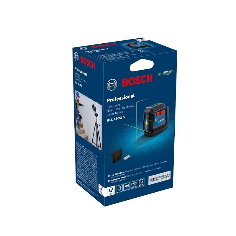 محافظت در برابر گرد و غبار و پاشش آب IP ۵۵ محدوده کاری تا ۱۲ متر دقت ± ۰.۶ mm/m* (*به علاوه انحراف وابسته به استفاده) نخ سه پایه ۱/۴ اینچ رنگ خط لیزر سبز دیود لیزر ۵۰۰ - ۵۴۰ نانومتر، < ۵ میلی وات دمای عملیاتی -۱۰ تا ۴۰ درجه سانتیگراد دمای ذخیره سازی -۲۰ تا ۷۰ درجه سانتیگراد کلاس لیزر ۲ محدوده خود تراز ± ۳.۵ درجه زمان تسطیح ۶ ثانیه منبع تغذیه ۲ x ۱.۵ V LR۶ (AA)، باتری ۳.۷ V Li-Ion (۱۰۰۰ mAh) زمان کارکرد (حداکثر) ۸ ساعت وزن، تقریبا ۰.۳۵ کیلوگرم فرافکنی ۲ خط محدوده کاری، مقدار ۱۲ متر